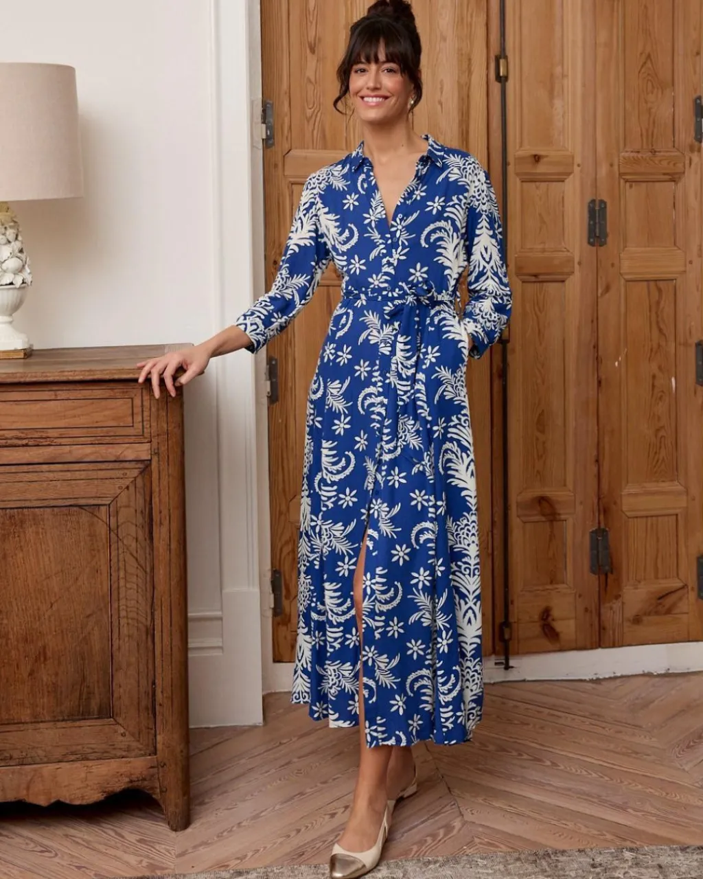 Vestido camisero largo con estampado floral sobre un fondo en color azul. Vestido con cuello de camisa. Cinturón a juego en la cintura. Manga 3/4. Hilera de botones desde el cuello hasta la altura del muslo. Falda larga, con abertura central. Vestido ideal para la lactancia.