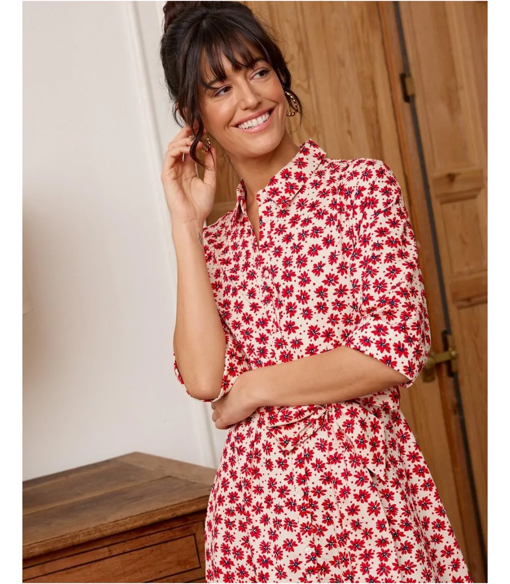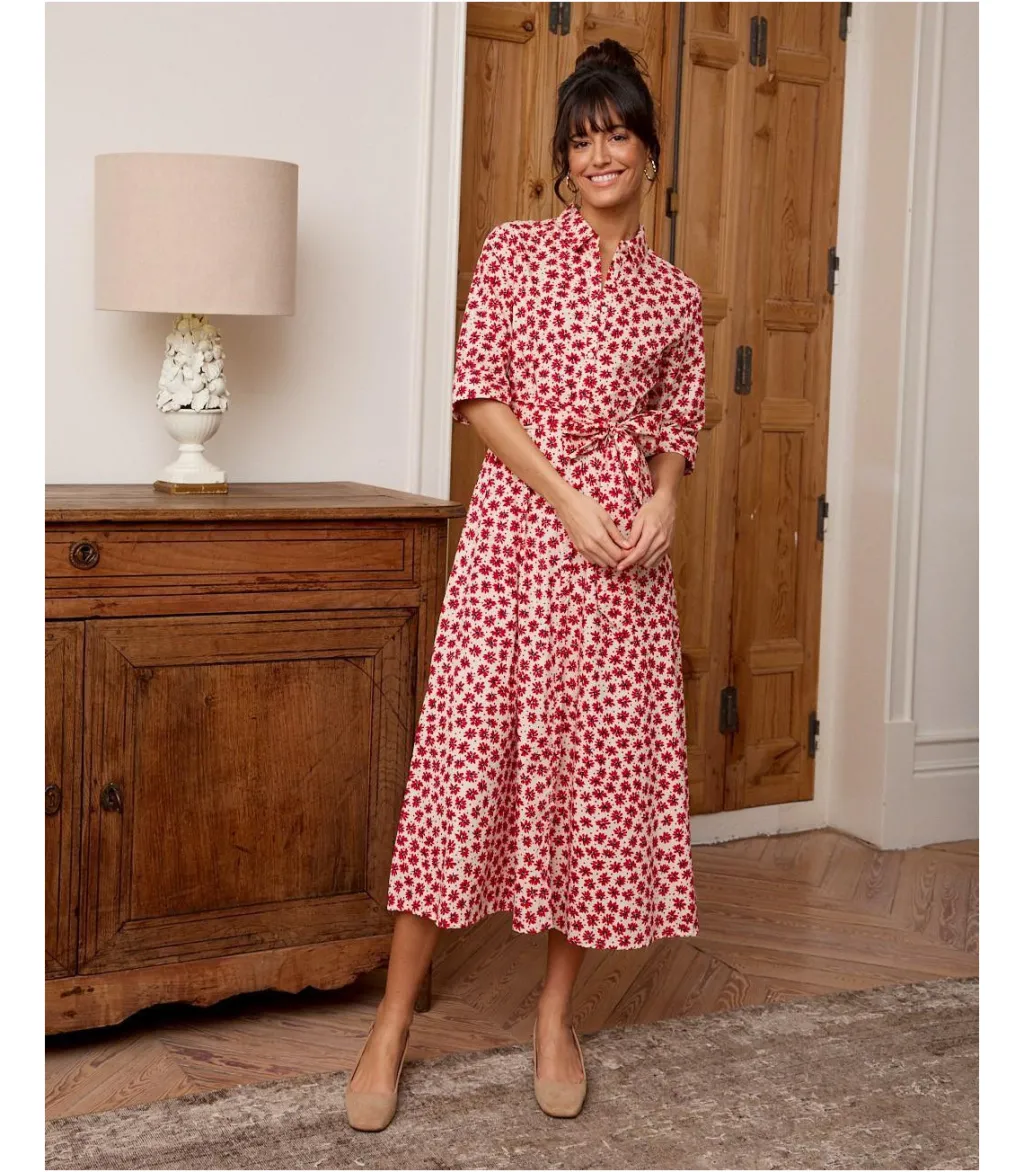 Vestido camisero largo con estampado floral sobre un fondo en color rojo. Vestido con cuello de camisa. Cinturón a juego en la cintura. Manga corta. Hilera de botones desde el cuello hasta el bajo. Falda larga, ligeramente acampanada, con abertura central. Vestido ideal para la lactancia.