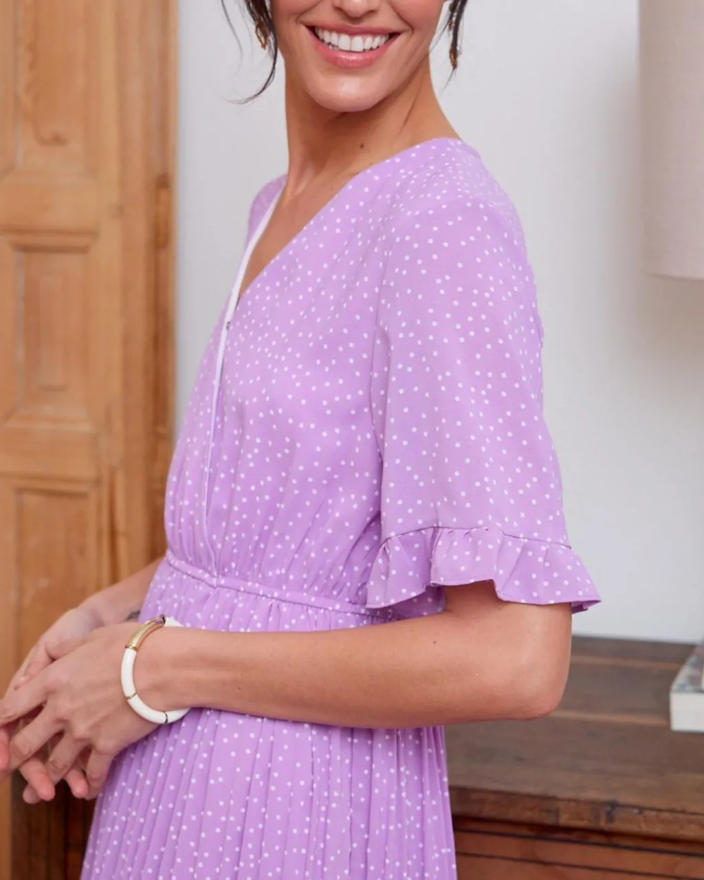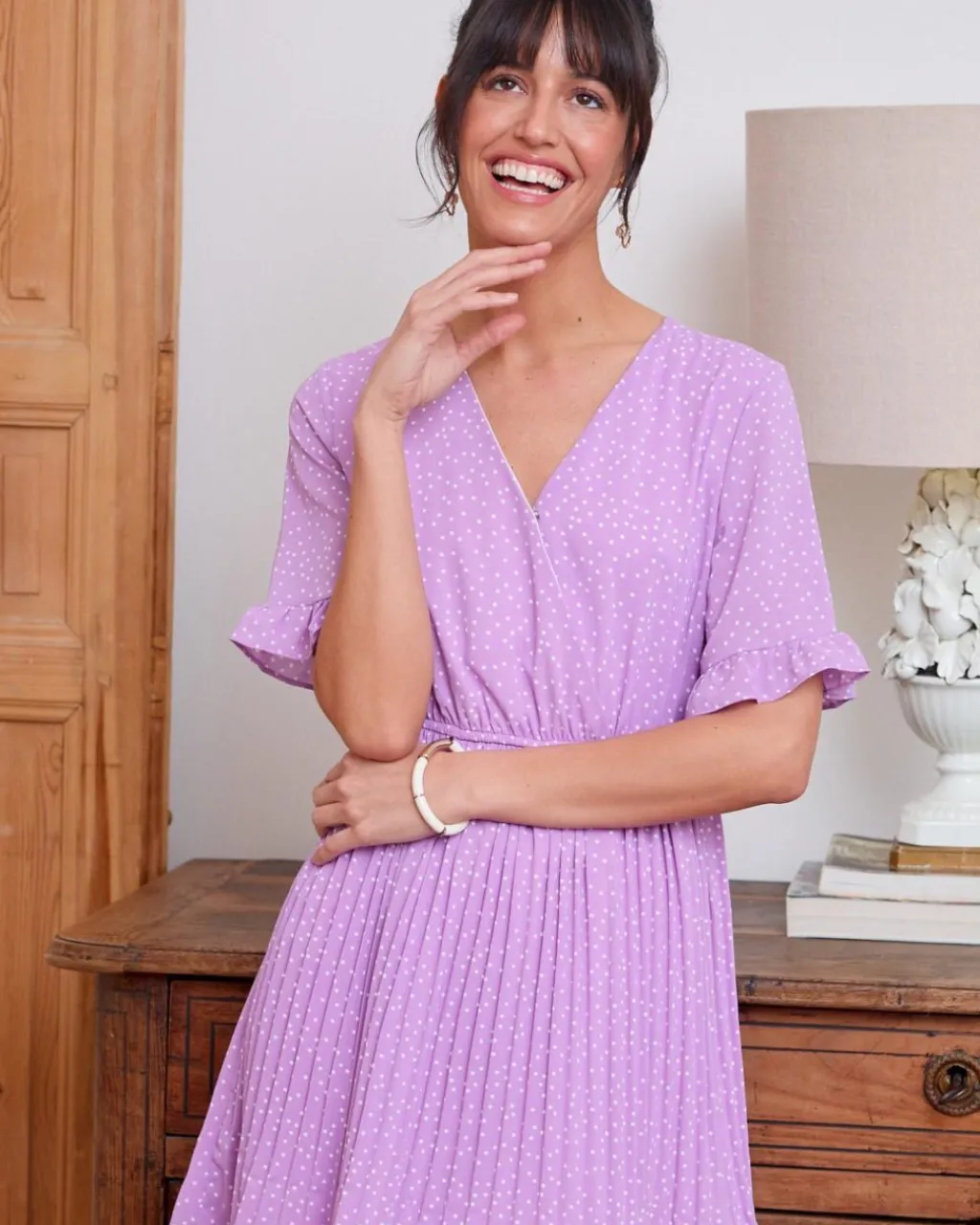 Vestido corto lila con estampado de lunares. Vestido con escote en pico y efecto cruzado en la parte superior. Modelo con manga corta y formando un volante al final. Falda corta tableada y fluida. Vestido ideal para la lactancia y primeros meses de embarazo. Ver másVer menos Referencia 180229 COMPOSICIÓN Y MEDIDAS:100% PoliésterBego mide 1,80 cm y lleva la talla S. Si dudas con la talla te recomendamos usar el recomendador online.CUIDADOS:Lavar a mano máximo 30º Ficha técnica Colores MORADOS Etiquetas: CLA K5107 – ENVÍOS, CAMBIOS Y DEVOLUCIONES Favorito41 ENVÍOS:Todos los envíos cuentan con gastos de envío, que dependen de la dirección de entrega.• Península y Portugal: 3,50€ | 2-4 días laborables.• Baleares: 6,50€ | Hasta 7 días laborables.• Países de la Unión Europea: 10,95€ | Hasta 10 días laborables.• Envíos a Europa (No UE): 15,95€ | Hasta 10 días laborables.• Resto del mundo*: Aprox 10€ | Hasta 15 días laborables.*NO hacemos envíos a Canarias, Ceuta, Melilla, Afganistán, Bielorusia, Congo, Bali, Myanmar, Nigeria, Rusia, Senegal, Somalia y Ucrania.¡Importante! En periodo de rebajas, los pedidos pueden tardar un poco más de lo habitual ¡Rogamos paciencia!CAMBIOS: ¡El envío con el cambio solicitado es gratuito!Pedidos realizados desde España:Plazo de 14 días laborables desde que recibes el paquete en casa.Pedidos realizados desde fuera de España:Plazo de 20 días naturales desde que realizamos el envío.*La gestión del envío del paquete de vuelta a nuestro almacén corre a cuenta del cliente, haciéndose cargo de los costes de este envío, mediante el courier de su elección o con nuestro servicio de DHL.En el primer trámite de cambio, el envío de vuelta es gratuito (tanto de talla como de producto). Permitimos DOS trámites de cambio, en caso de querer tramitar un segundo cambio, se descontarán los gastos de envío según destino.Una vez recibido el paquete en nuestro almacén, tramitaremos tu cambio en un plazo máximo de hasta 10 días laborables. Recibirás un correo de confirmación cuando este pedido de cambio esté listo para ser enviado.