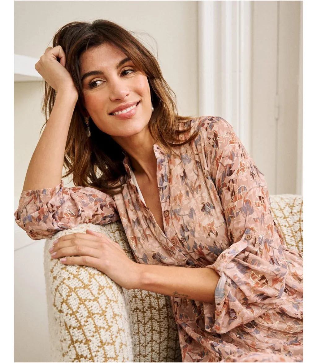 Vestido camisero de largura midi con estampado floral en color nude. Cuello de camisa. Modelo de manga larga terminado en puño. Corte bajo el pecho con cordel para ajustar el vestido. Dispone de forro interior. Falda midi con vuelo y corte a mitad de falda con bajo irregular.