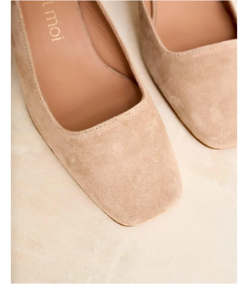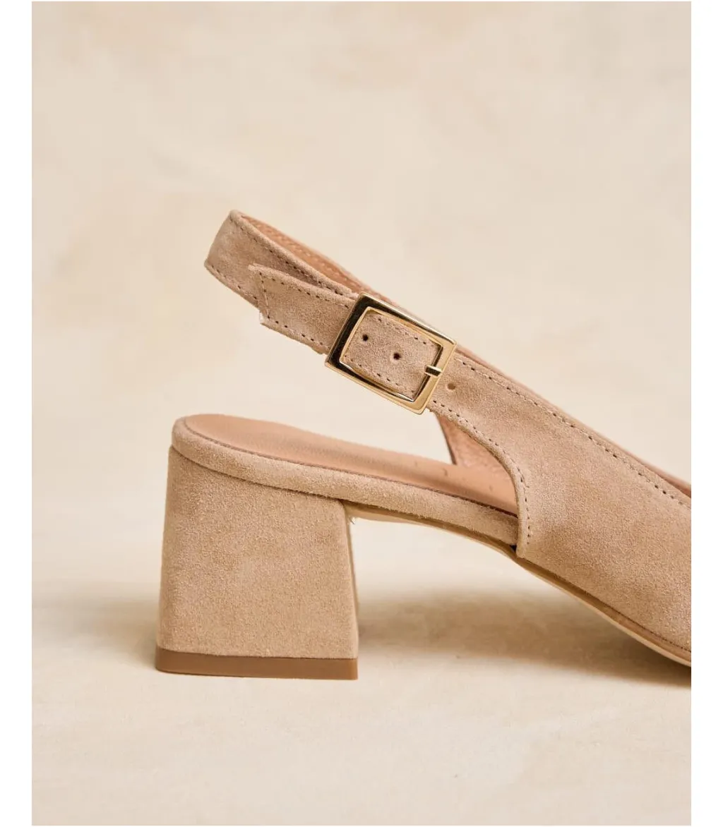 Bailarina de ante destalonada en color arena. Puntera cuadrada. Correa al talón con hebilla. Pequeño tacón cuadrado. Es un calzado diferente y cómodo para combinarlo tanto con pantalones como con vestidos.