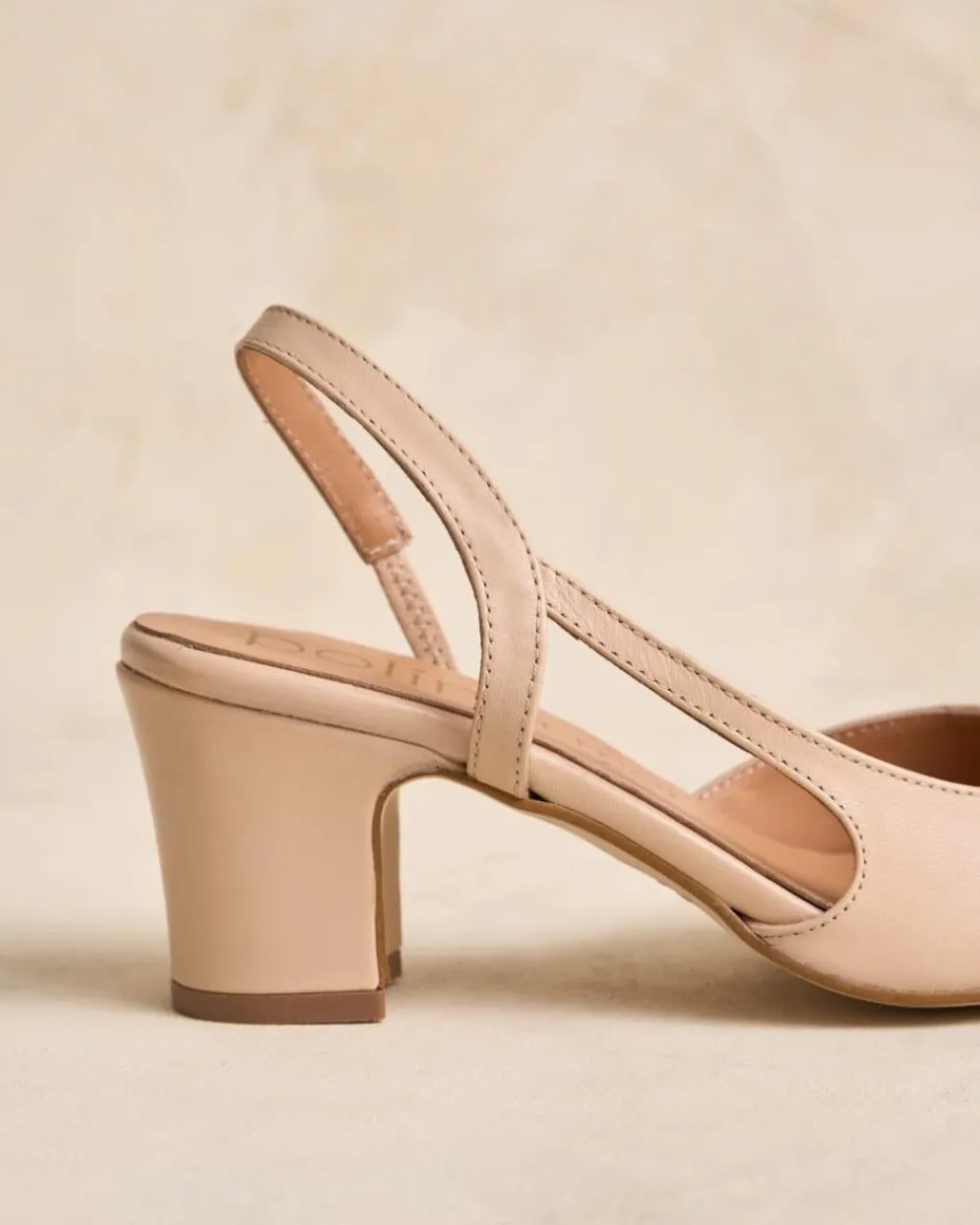 Bailarina de piel con tacón y bicolor: negro y nude. Zapato destalonado. Punta ligeramente cuadrada en otro color. Escote redondeado. En la puntera tiene un corte diagonal. Un zapato elegante y cómodo.
