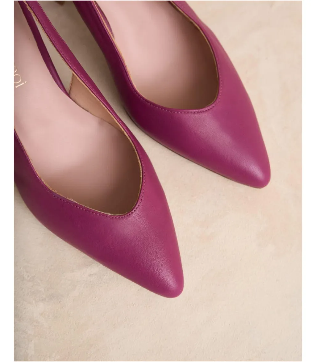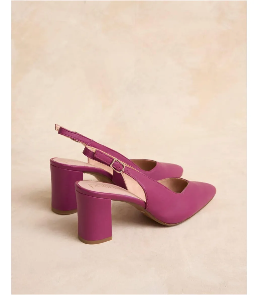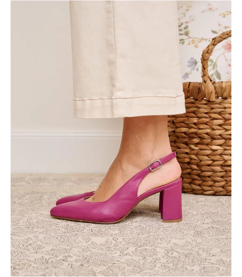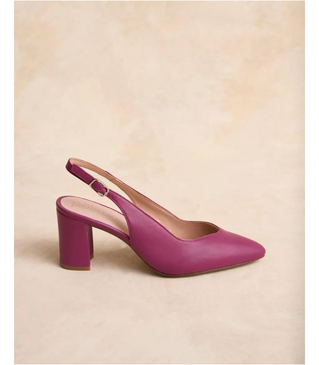 Zapato de piel destalonada en color buganvilla. Puntera puntiaguda. Correa con elástico al talón. Tacón cuadrado. Es un calzado diferente y cómodo para combinarlo tanto con pantalones como con vestidos.