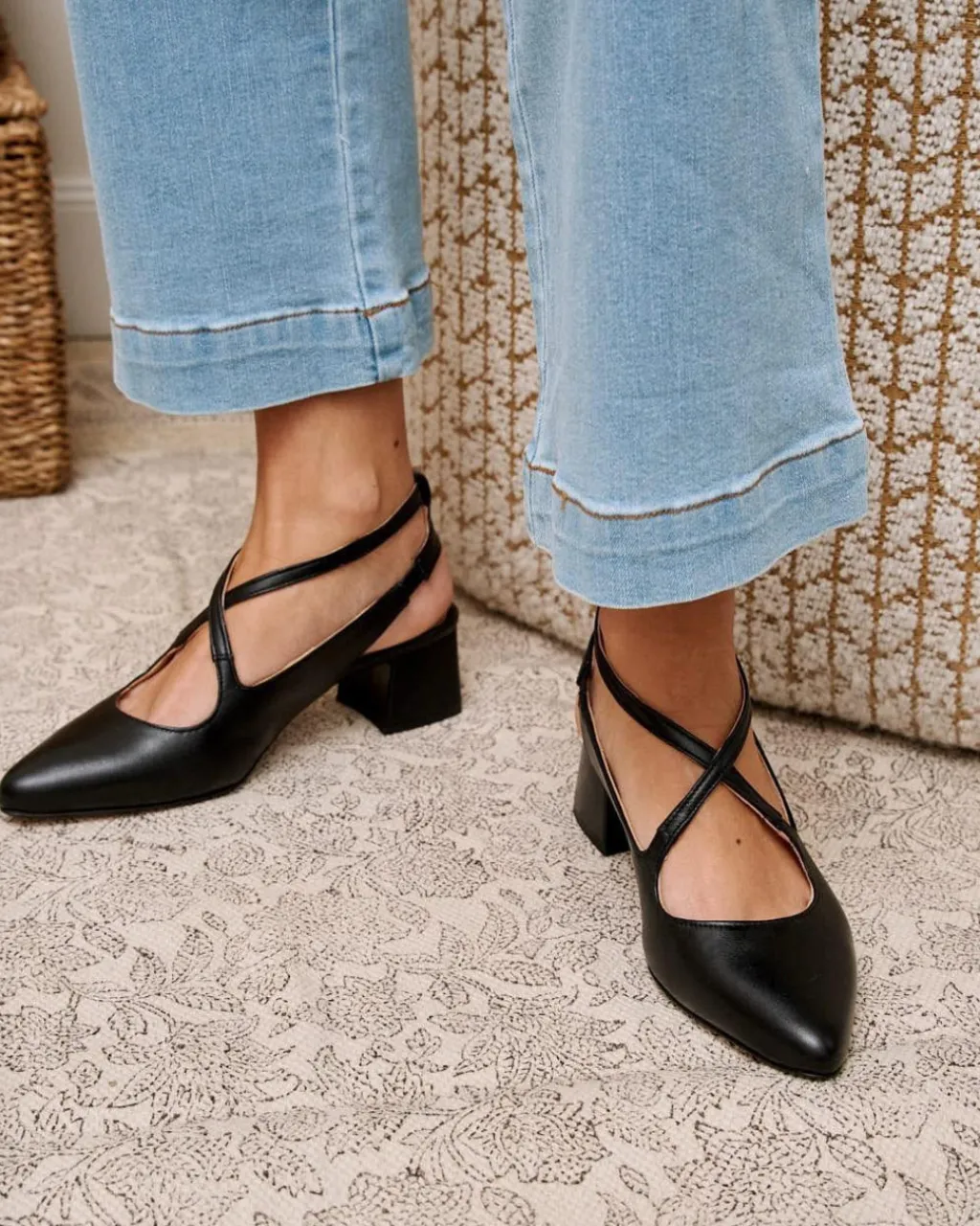 Zapato destalonado de piel en color negro para tus eventos de esta temporada. Puntera cerrada ligeramente pronunciada. Detalle de cintas de piel cruzadas en el empeine. Cierre al tobillo mediante correa regulable con hebilla cuadrada. Tacón bajo y cuadrado con acabado en el mismo tono que el resto del zapato. Un zapato muy femenino y cómodo.