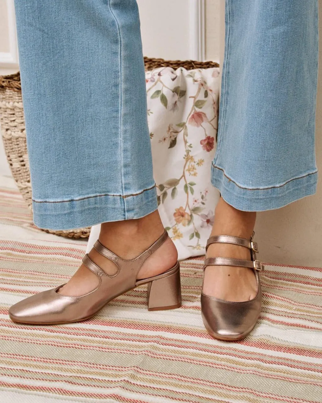 Mercedita de piel en color bronce. Un modelo destalonada y elegante de estilo parisino con un exterior confeccionado en piel, pasadores al empeine y punta ligeramente cuadrada. Un tacón medio que la hace especial y única e igual de cómoda que las clásicas merceditas, pero perfectas para esta primavera-verano.