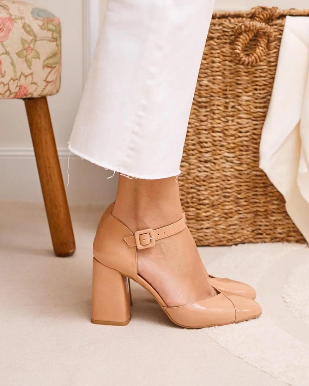 Zapato de tacón en tono piedra. Puntera cerrada y escote en forma de corazón. Cierre al empeine mediante correa regulable con hebilla cuadrada. Tacón alto y cuadrado con acabado en el mismo tono que el resto del zapato. Un zapato muy femenino y cómodo.